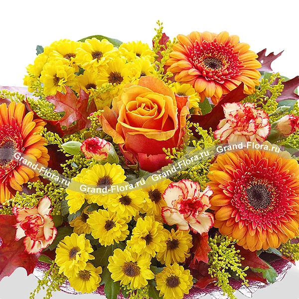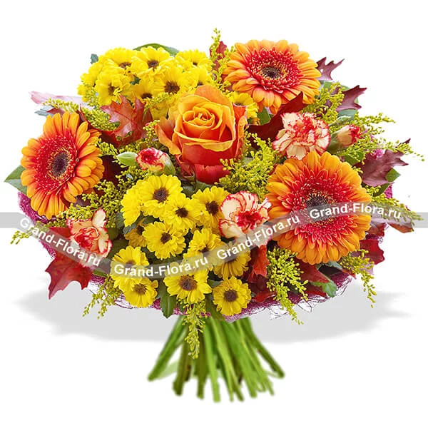 Стандартный (на фото): роза оранжевая - 1 шт., гербера оранжевая - 3 шт., хризантема желтая кустовая (мелкоцветная) - 2 шт., гвоздика кустовая оранжевая - 2 шт., солидаго - 3 шт., сетка бордовая.